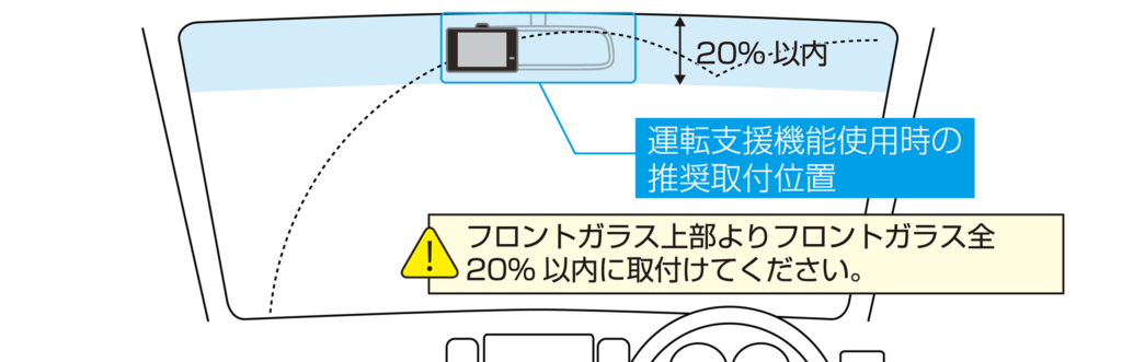 ●フロントガラスへの取付けは、道路運送車両法に基づく保安基準により設置場所が限定されています。フロントガラス上部より20%以内になるように設置してください。※道路運送車両の保安基準第29条(窓ガラス)、細目告示第195条および別添37