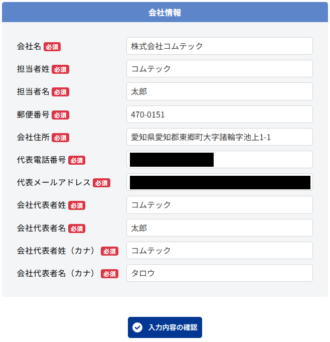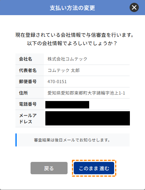 会社情報が確認のため表示されます。修正がなければ「このまま進む」をクリックします。 修正が必要な場合は「戻る」をクリックし、会社情報を編集してください。 |