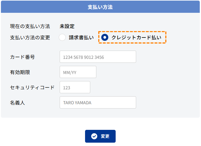 支払い方法から「クレジットカード払い」を選択し、「クレジットカード情報」を入力後、「変更」をクリックします。 |