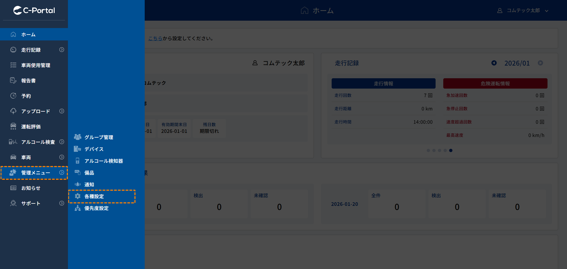 サイドメニューの[管理メニュー] → [各種設定] をクリックします。 |