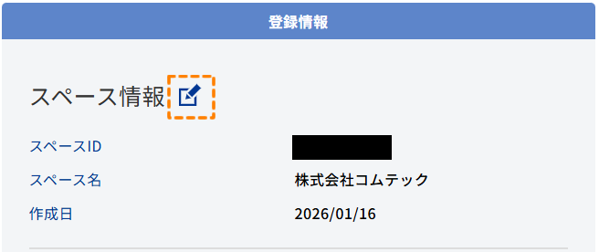 スペース管理画面には基本情報が表示されています。より詳細な情報を確認するには、以下手順にてご確認ください。