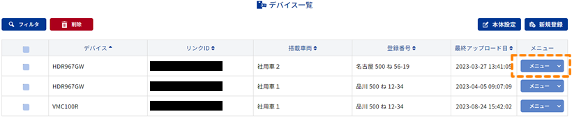 デバイス一覧からデバイス情報を編集したいデバイスの[メニュー]をクリックします。 |