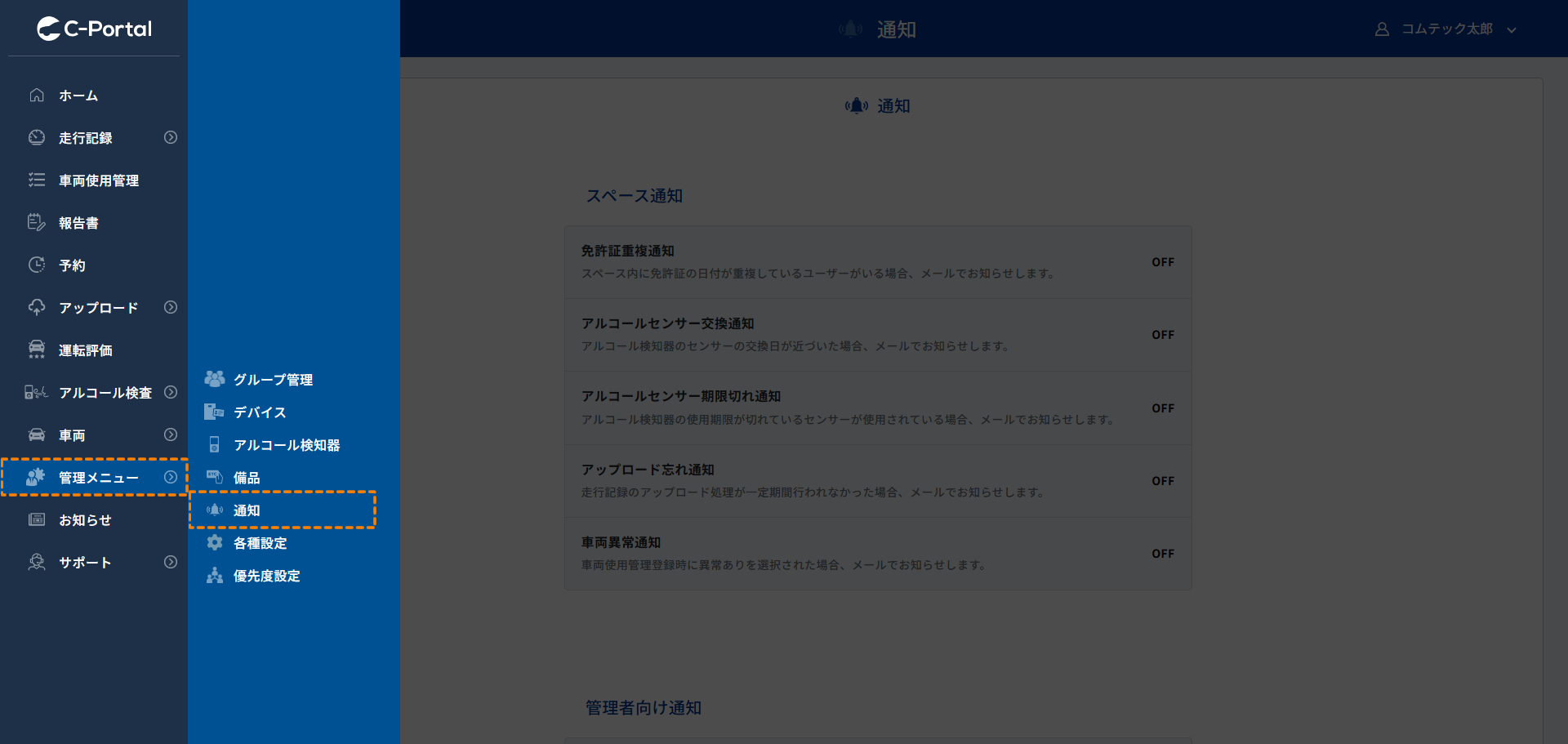 サイドメニューの[管理メニュー]→[通知]をクリックします。 |