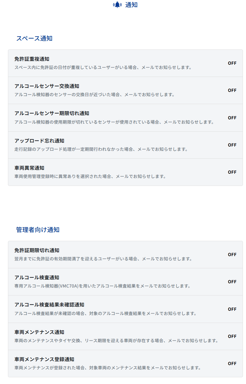 各種通知の受信設定は、管理者アカウントごとにログインして設定してください。 |