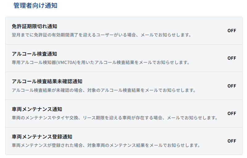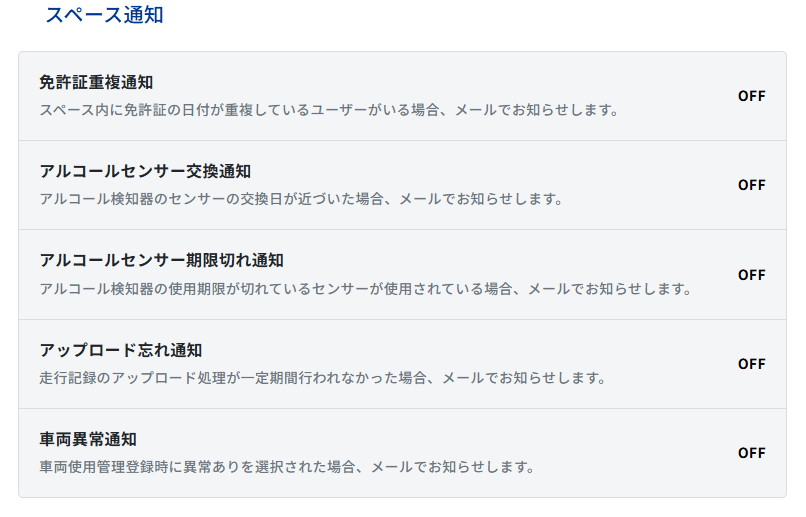 上図の場合、「社用車1」「社用車2」「社用車5」の車両で、車両使用管理登録時に「異常あり」を選択された際にメールが通知されます。