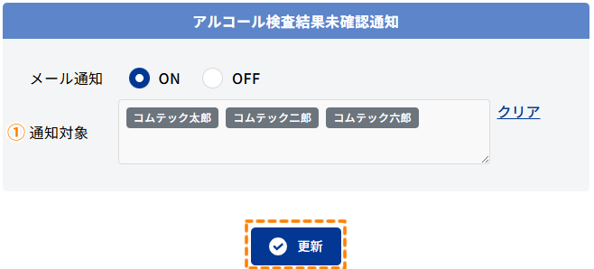上図の場合、「コムテック太郎」「コムテック二郎」「コムテック五郎」がアルコール検査を実施した際にメールが通知されます。