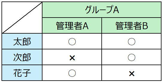 上表の場合、グループ管理者Aは「太郎」「花子」が行ったアルコール検査結果の通知を受信でき、グループ管理者Bは「太郎」「次郎」が行ったアルコール検査結果の通知を受信できます。