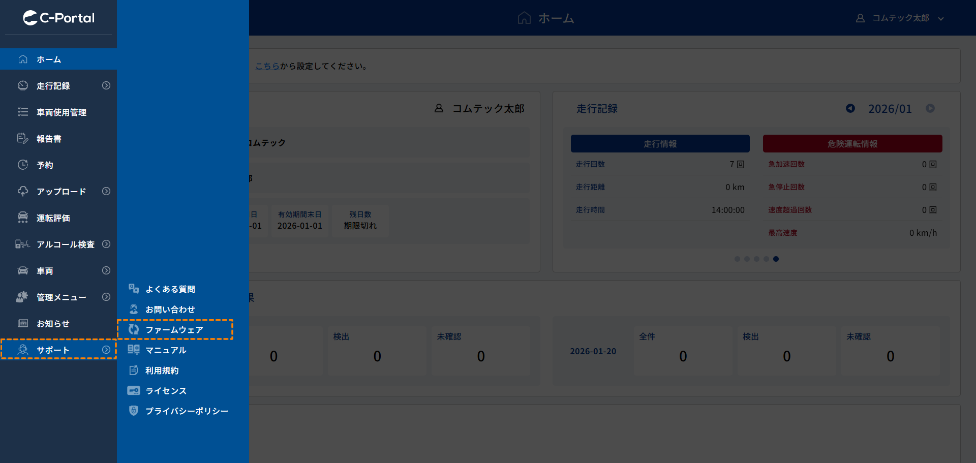サポートメニューで[ファームウェア]をクリックします。 |