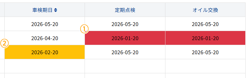 | ① | 赤色: | 期限超過、または期限まで30日以内 |