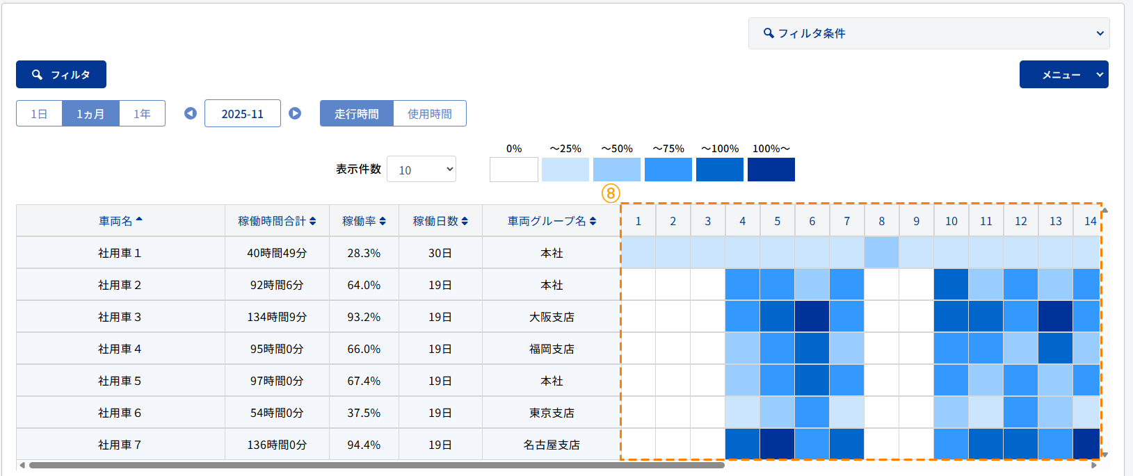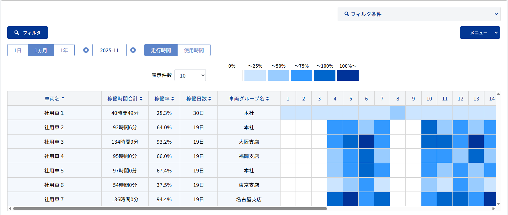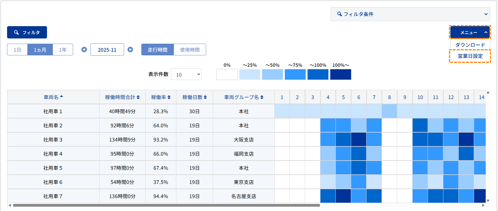 ※稼働率の計算は前日までにアップロードされた走行記録を元に算出されるため、当日アップロードした走行記録は翌日反映されます。