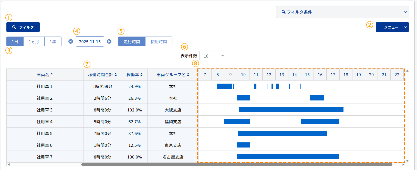 | ⑧ | 稼働状況【日表示の場合】 ※24:00をまたぐ走行(当日23:00に乗車し、翌日1:00に降車した場合など)があった場合、24:00を超えた時間の帯表示は行われませんが、24:00を超えた分の稼働時間は当日分として算出されます。 |