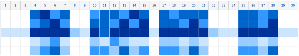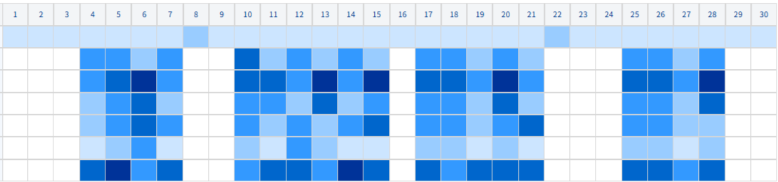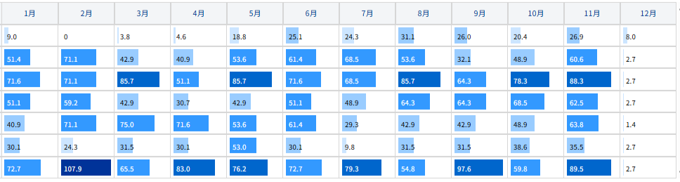 | 月単位の稼働率を6段階で表示し、色は稼働率が高いほど濃く表示されます。 |