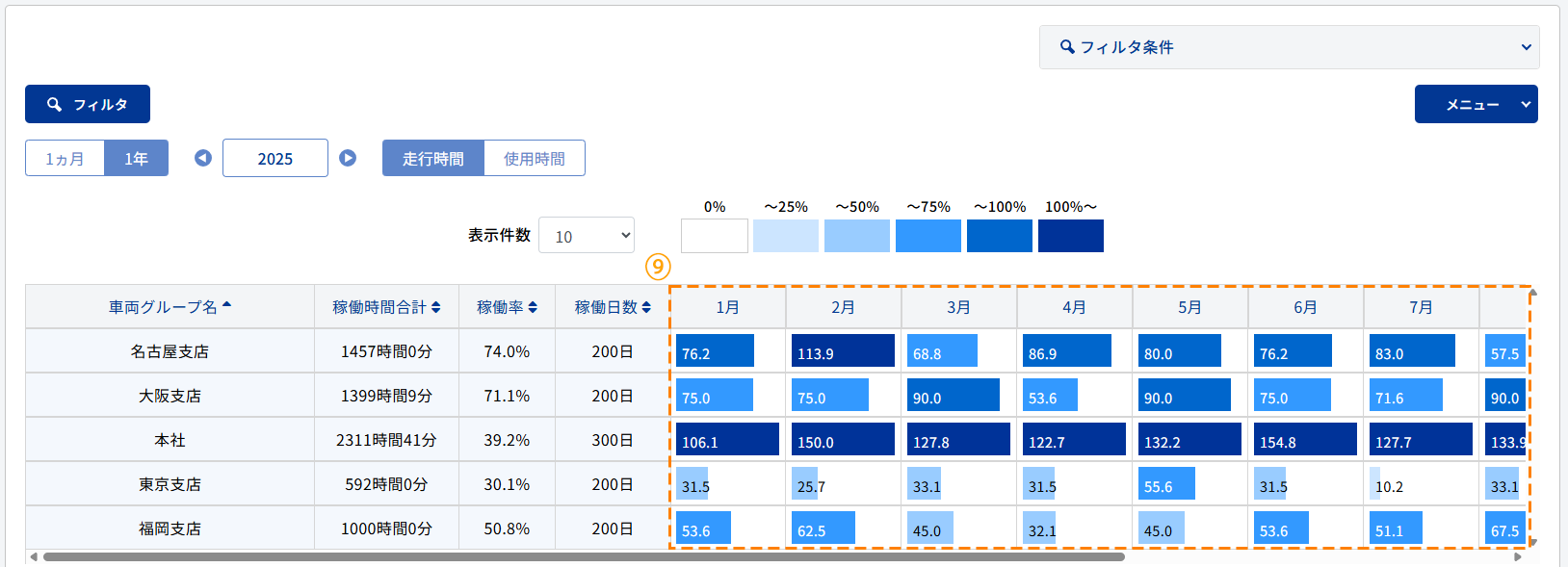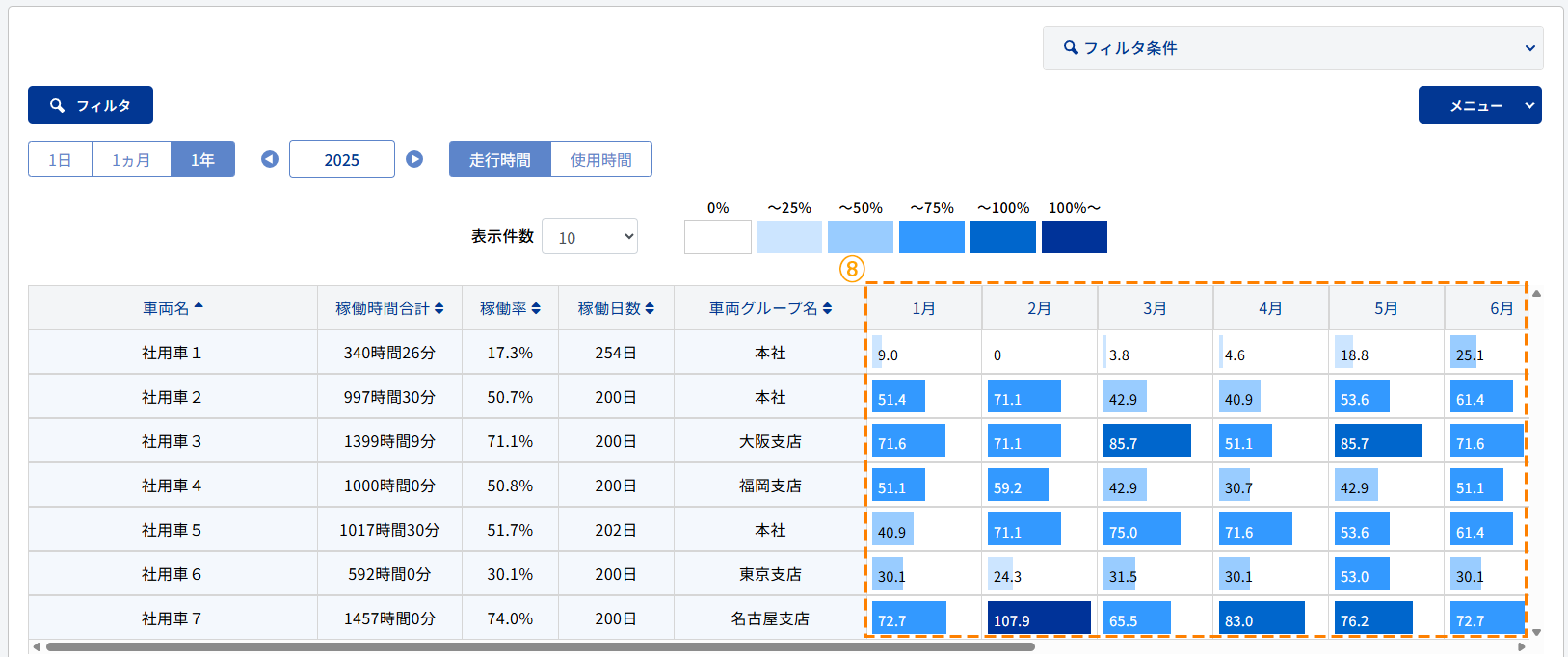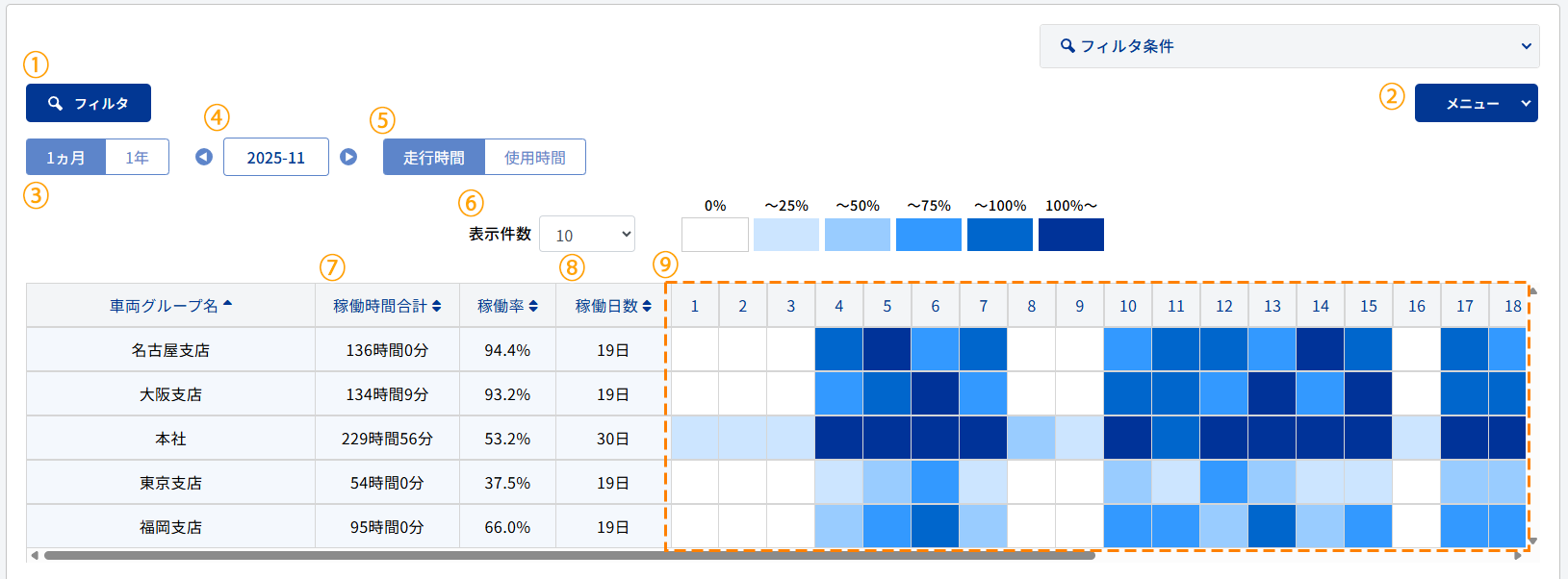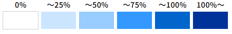 | 月単位の稼働率を6段階で表示し、色は稼働率が高いほど濃く表示されます。 | |||