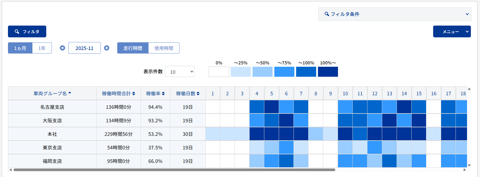 稼働率(車両グループ)が表示されます。 |