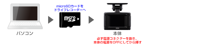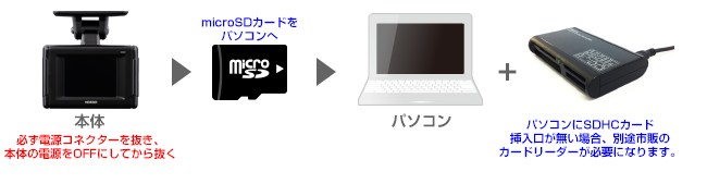 | 3. | 電源OFFの状態のドライブレコーダーからmicroSDカードを抜きパソコンに接続します。 ※パソコンにmicroSDカードの挿込口がない場合は別途カードリーダーが必要になります。 |