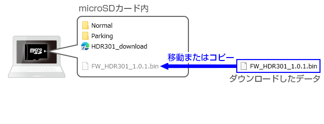 | 4. | パソコンでmicroSDカードを開き、ダウンロードした『FW_HDR301_1.0.1.bin』というファイルを、microSDカードの直下に移動またはコピーします。 | ||||||||||||||||||||||||